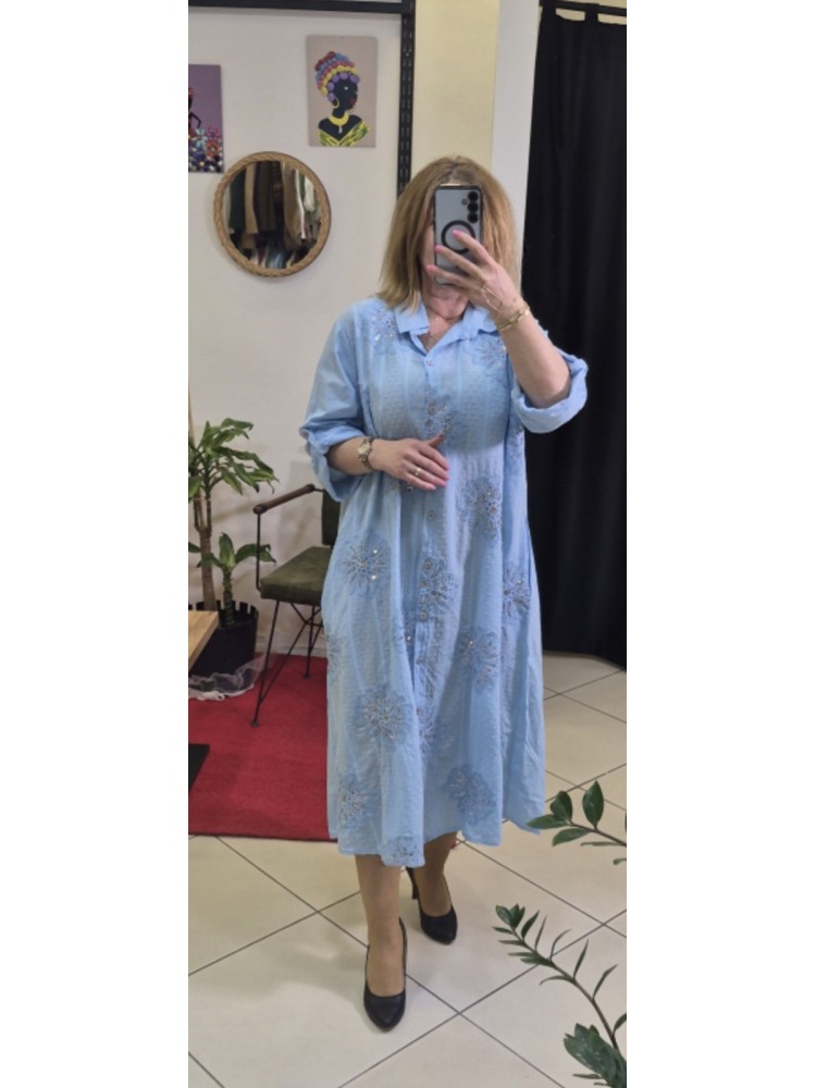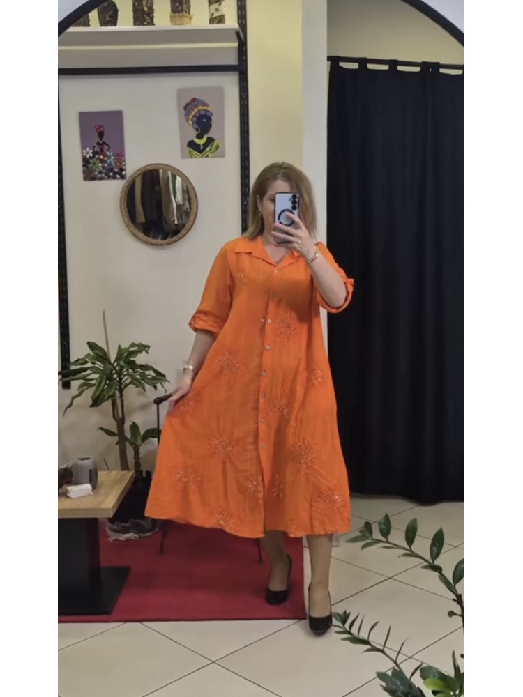 İTALYAN KRİZANTEM DESEN KABARTMALI PUL DETAYLI GÖMLEK ELBİSE