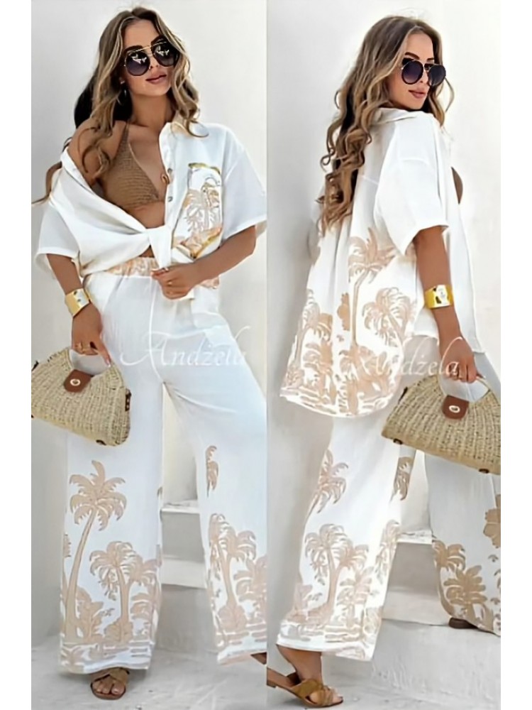 - Palmiye desenleriyle yaz ruhunu yansıtan keten gömlek pantolon takımı, şıklığı ve rahatlığı bir arada sunar.